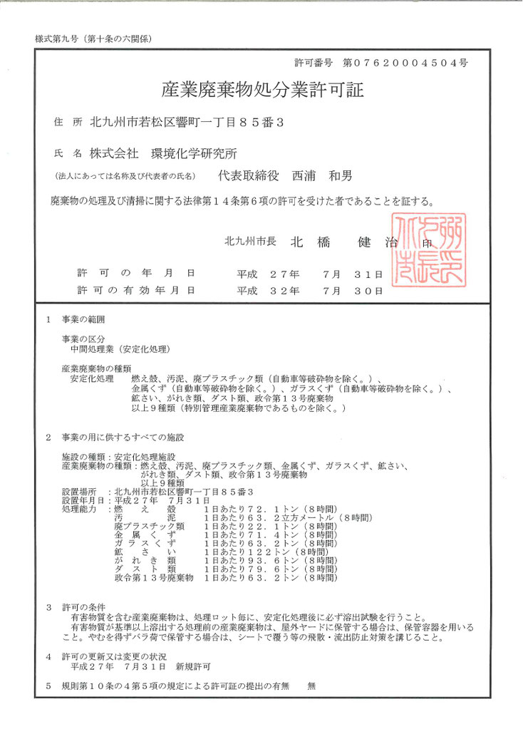 燃え殻、汚泥、廃酸、廃アルカリ、廃プラスチック類(自動車等破砕物を除く。)、ガラスくず(自動車等破砕物を除く。)ダスト類、政令第13号廃棄物以上8種類 (石綿含有廃棄物を含み、特別管理産業廃棄物であるものを除く。)